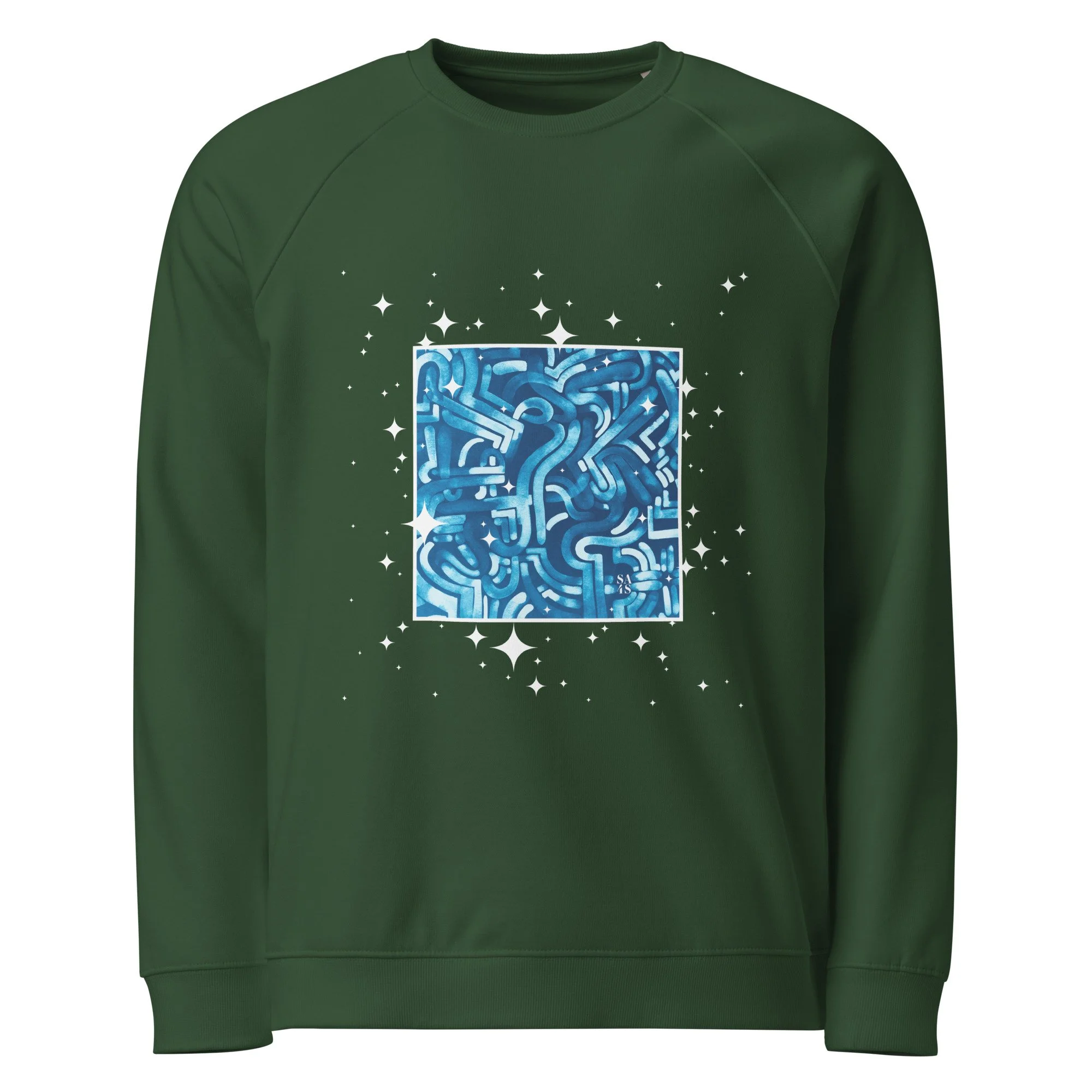 Blue version of art 19, original painted with watercolor, printed in a square surrounded by sparkles, front print